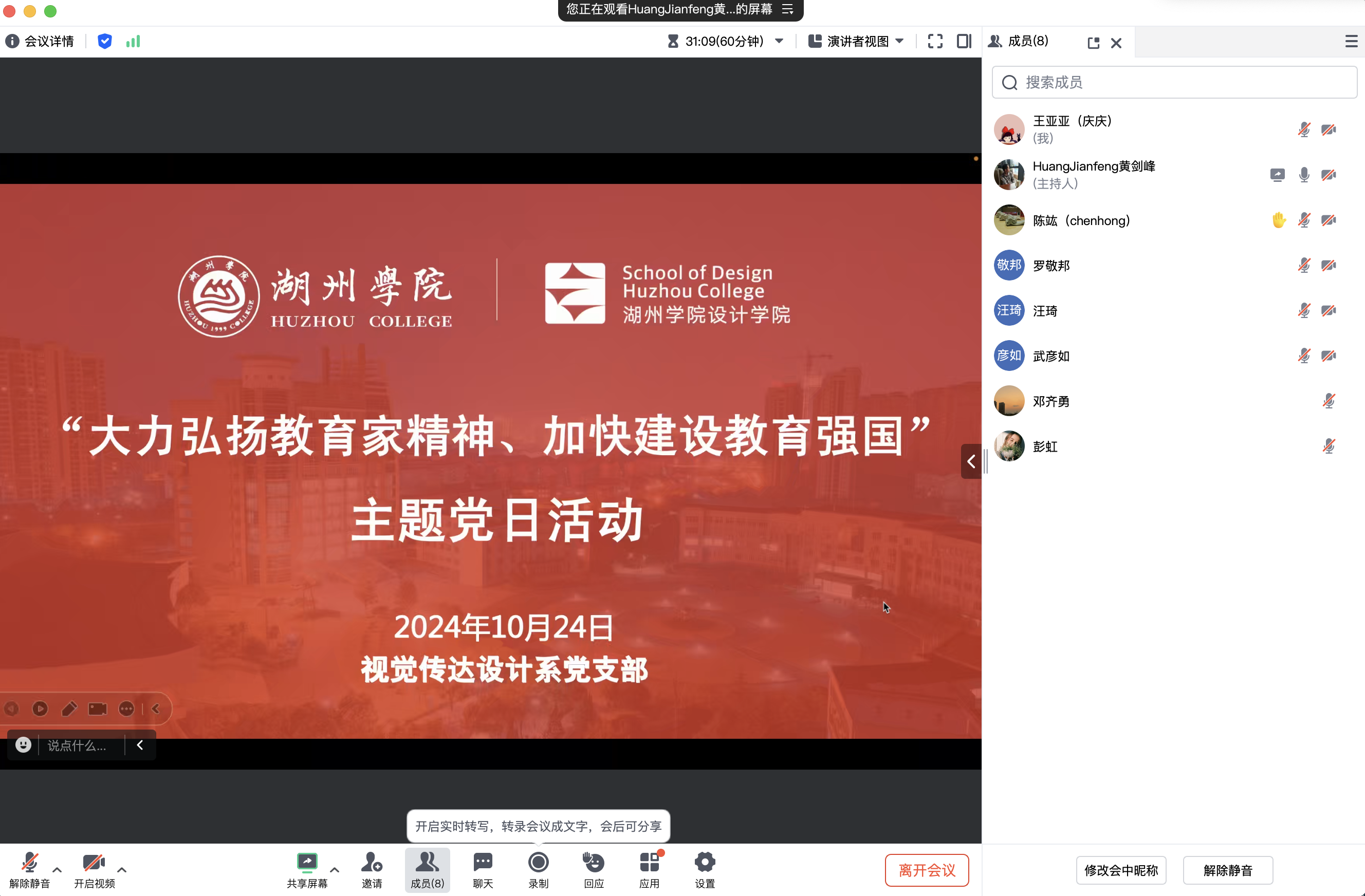 为深入学习贯彻党的教育方针,弘扬伟大的教育家精神,10月26日,视觉传达设计系党支部线上开展了“大力弘扬教育家精神,加快建设教育强国”主题党日活,活动由党支部书记黄剑峰主持,8名教师党员共同参与。