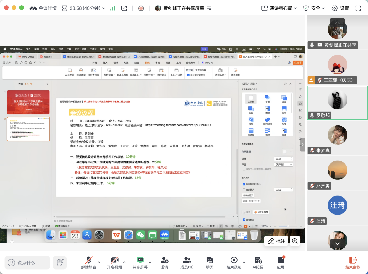 为深入贯彻中央八项规定精神,持续深化基层党建作风建设,2025 年 9 月 23 日,设计学院视觉传达设计系党支部通过腾讯会议召开专题总结会。会议系统回顾 “学规定、强作风、促发展” 阶段性工作成效,并对全省党建 “双创” 样板支部结项冲刺工作进行部署。学院副院长尹长根在线指导会议,支部书记黄剑峰主持会议。