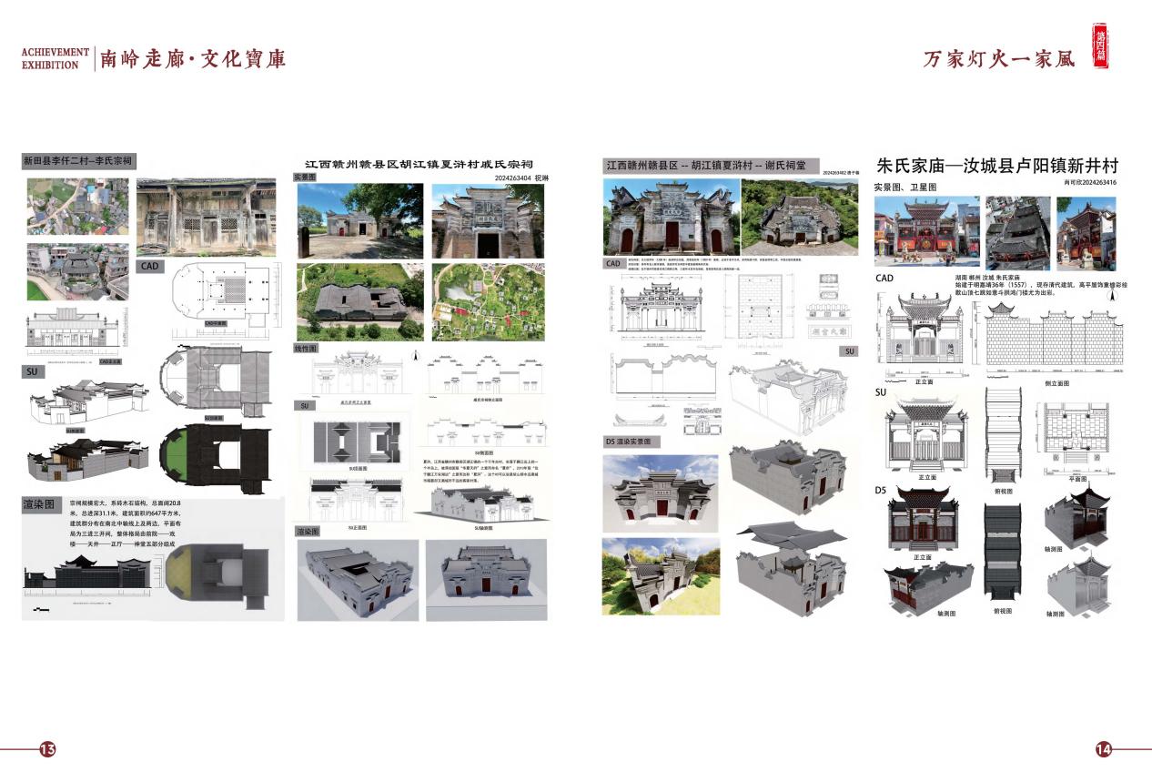 展览现场,百余件参展作品按“乡土的营造”、“ 梁柱的意味”等五大篇章有序呈现。从江西瑞金马堡镇密溪村的罗氏祠堂群,到湖南郴州永兴县板梁村的贤公厅,再到广西贺州临贺古城的莫氏宗祠,学生们通过 CAD 制图、SU 建模、场景渲染等专业技术,精准还原了不同地域、不同时期祠堂的建筑布局、结构细节与装饰纹样。展板上祠堂建筑的实拍图、制图的解析图文并茂,画框中传统纹样的数字还原细腻精巧,平面图、立面图、爆炸图则清晰呈现了祠堂的空间逻辑,让观众直观领略到祠堂建筑中蕴含的礼制思想、地域特色与艺术匠心。