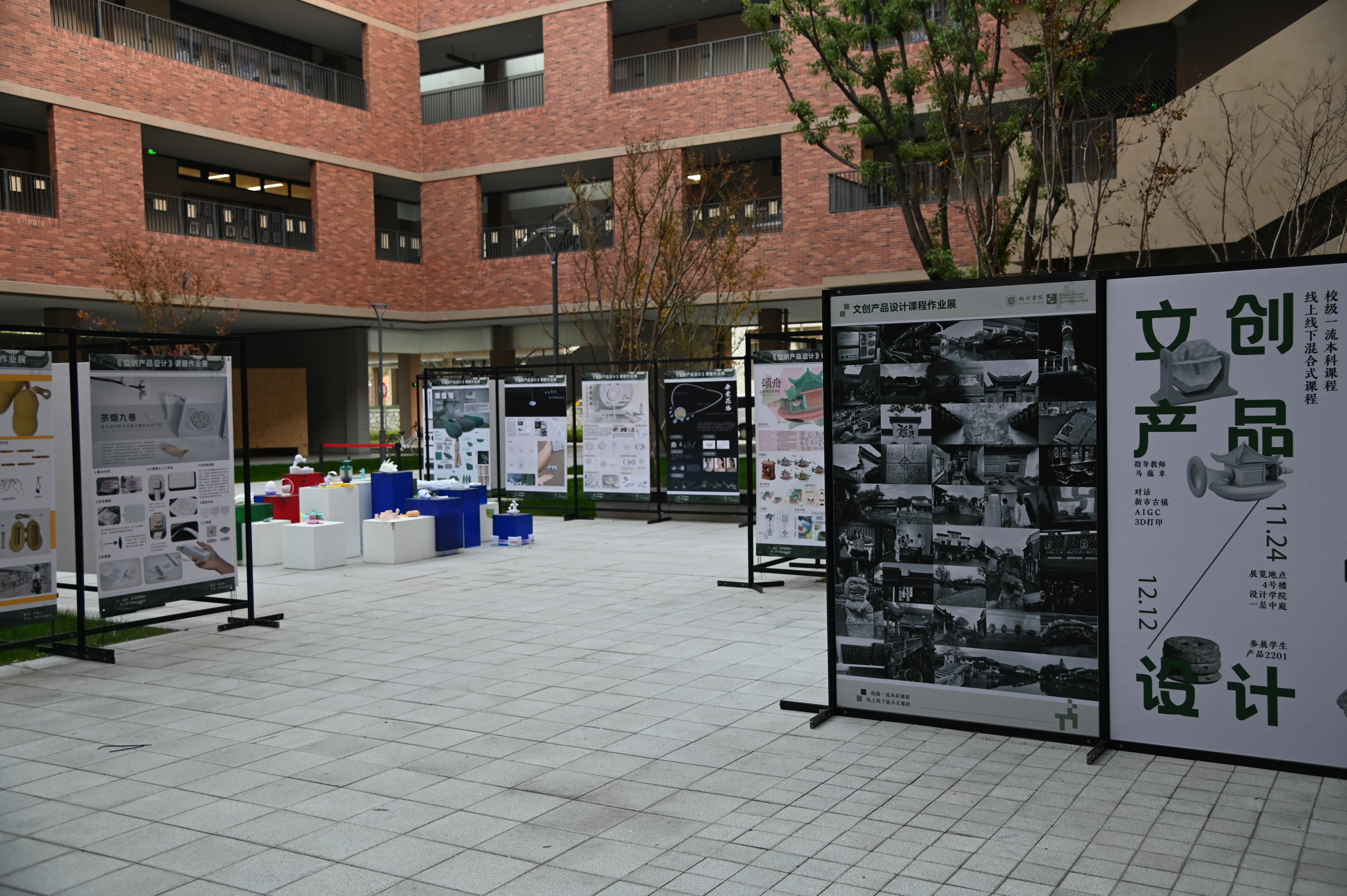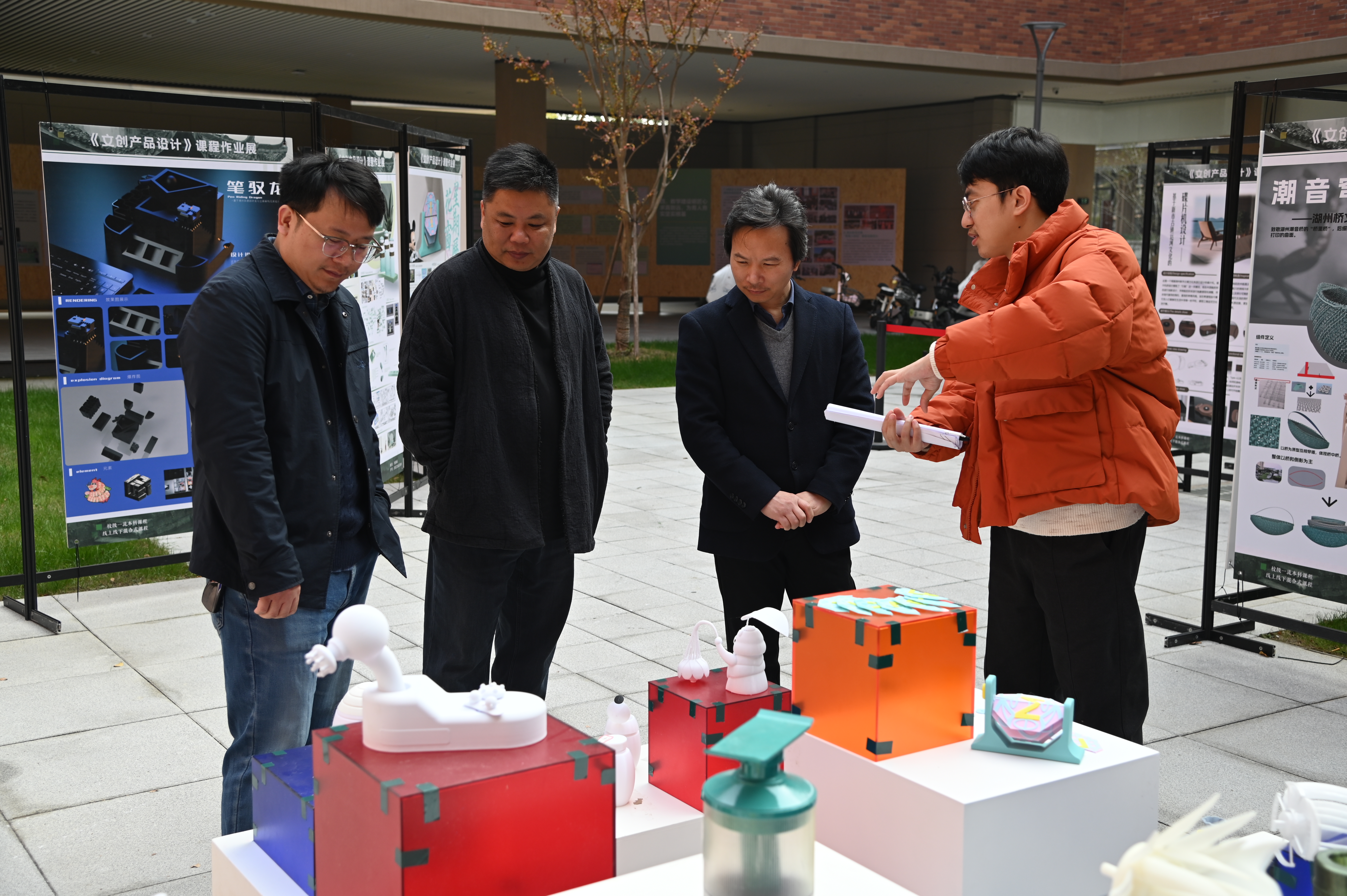 2025年12月1日上午,设计学院产品设计专业在4号楼中庭展厅举办了《文创产品设计》课程作品展。湖州学院设计学院院长毛攀云、副院长尹长根、党总支副书记邓剑刚莅临展览现场指导。本次展览集中展示了产品设计2201班级35名学生在该课程中的作业成果,学生作品涵盖文具、家居、饰品等多个品类,巧妙提取新市古镇的民俗符号、建筑纹样与非遗技艺,赋予其符合当代审美的功能与形态。