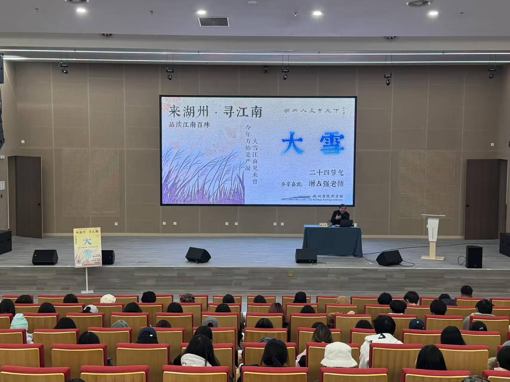 二十四节气,品湖州韵味。12月17日晚,图书馆联合设计学院在图书馆报告厅举行湖州地方文化专场分享会。本次活动以“来湖州・寻江南”品读江南百味为主题,特邀江南乡土文化研究者谢占强老师主讲。设计学院2025级全体新生参加。