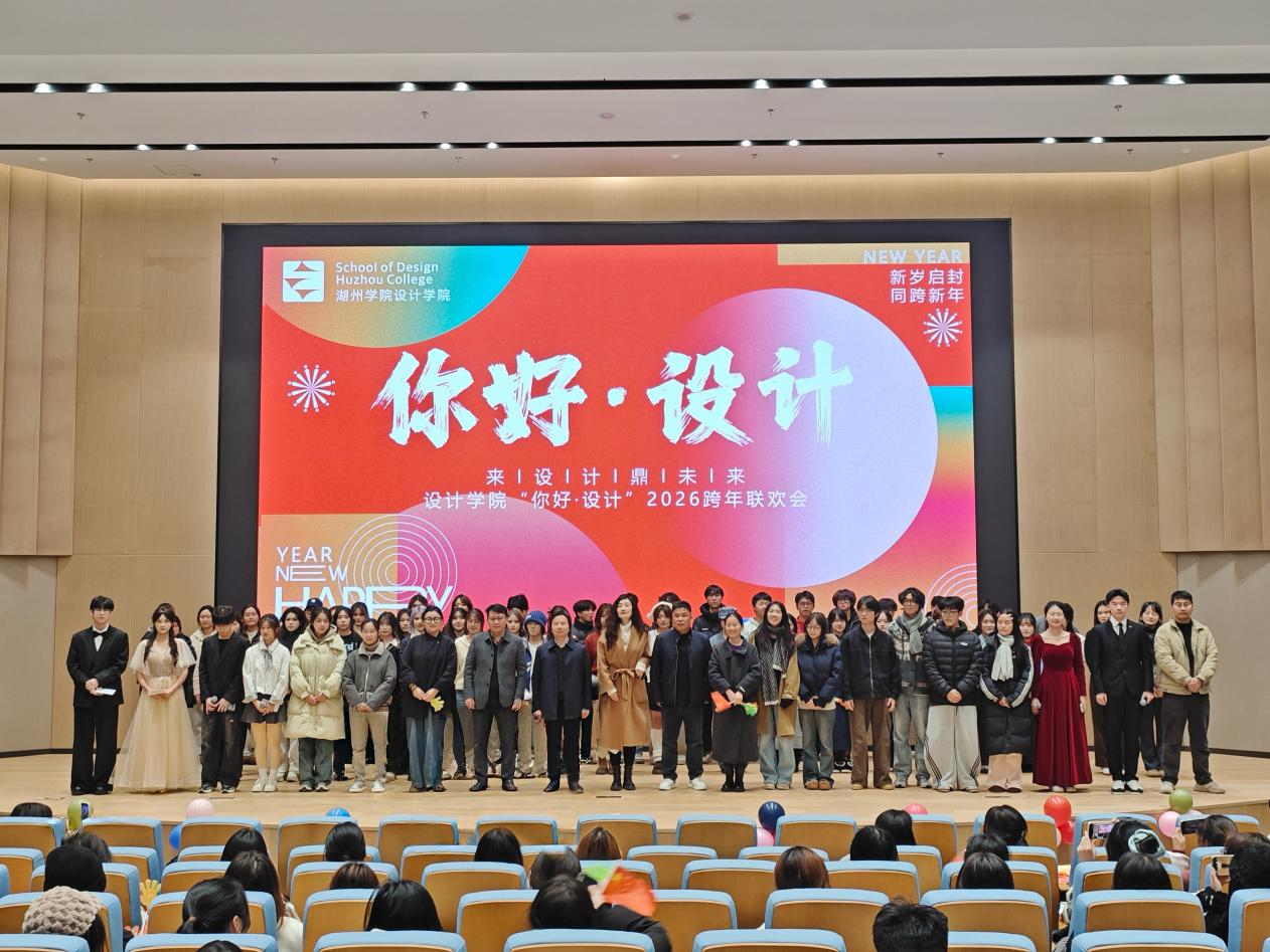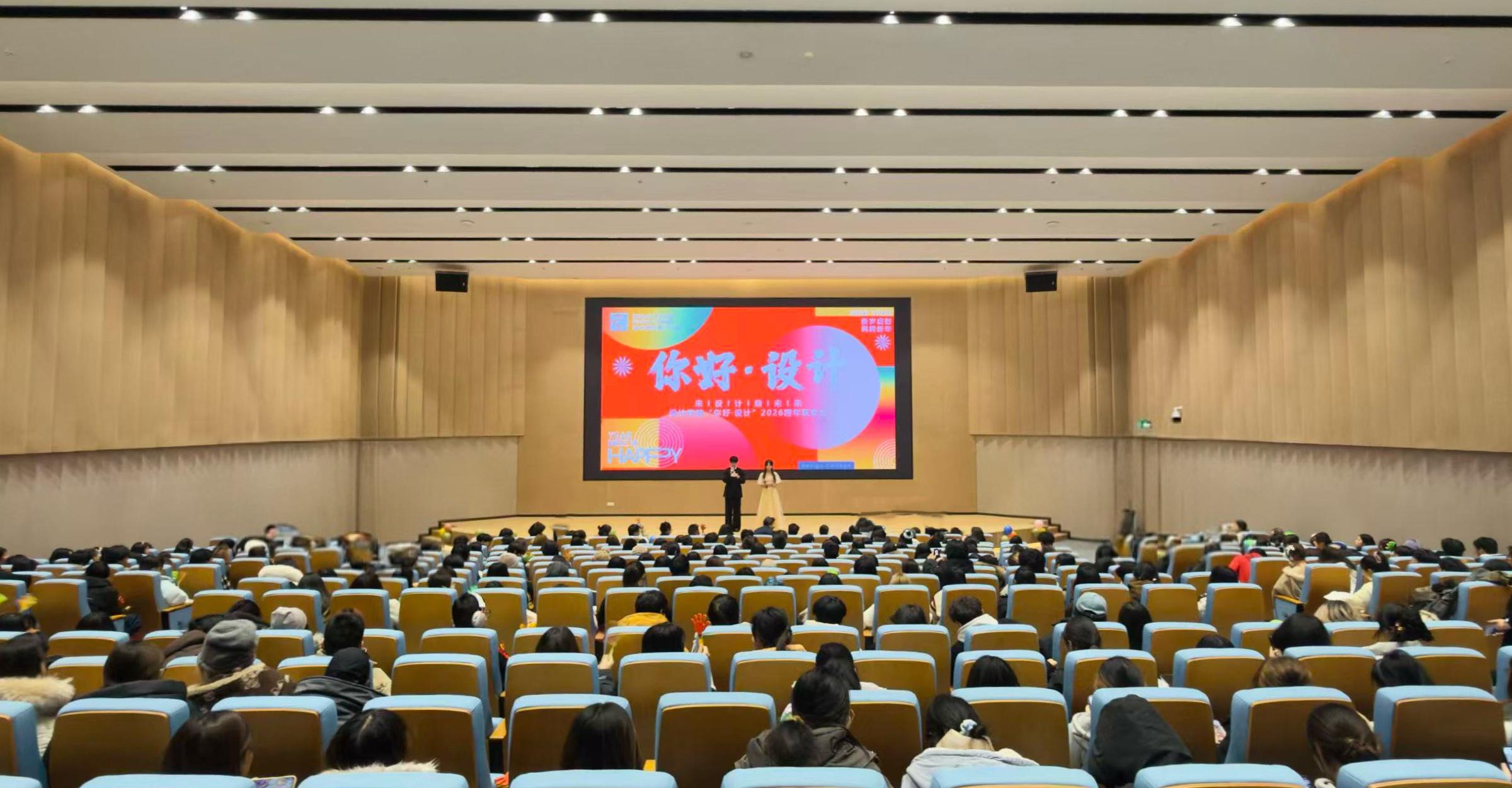 岁序更替,华章日新;以艺赋能,逐光前行。为进一步丰富校园文化生活,充分展现设计学子昂扬向上的青春风采,凝聚学院高质量发展的强大合力,12月30日晚,设计学院“你好·设计”2026跨年联欢会在师生活动中心一楼报告厅圆满落幕。院长毛攀云、党总支书记朱亚莉、副院长尹长根、党总支副书记邓剑刚出席活动,综合办、学工办、教学办相关教师与学院学子欢聚一堂,共赴艺术之约,以奋进姿态迎接2026年的到来。