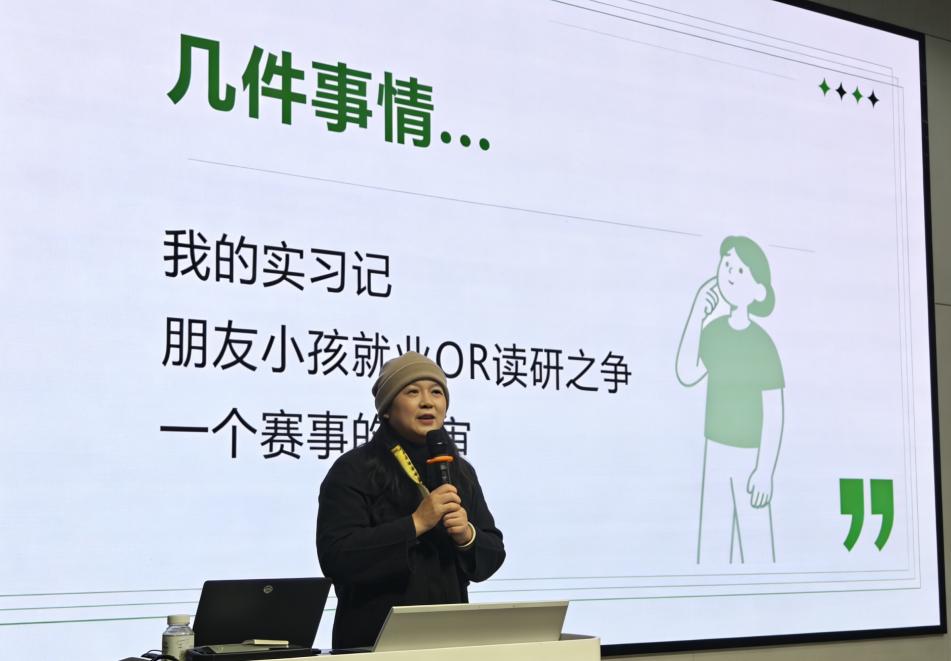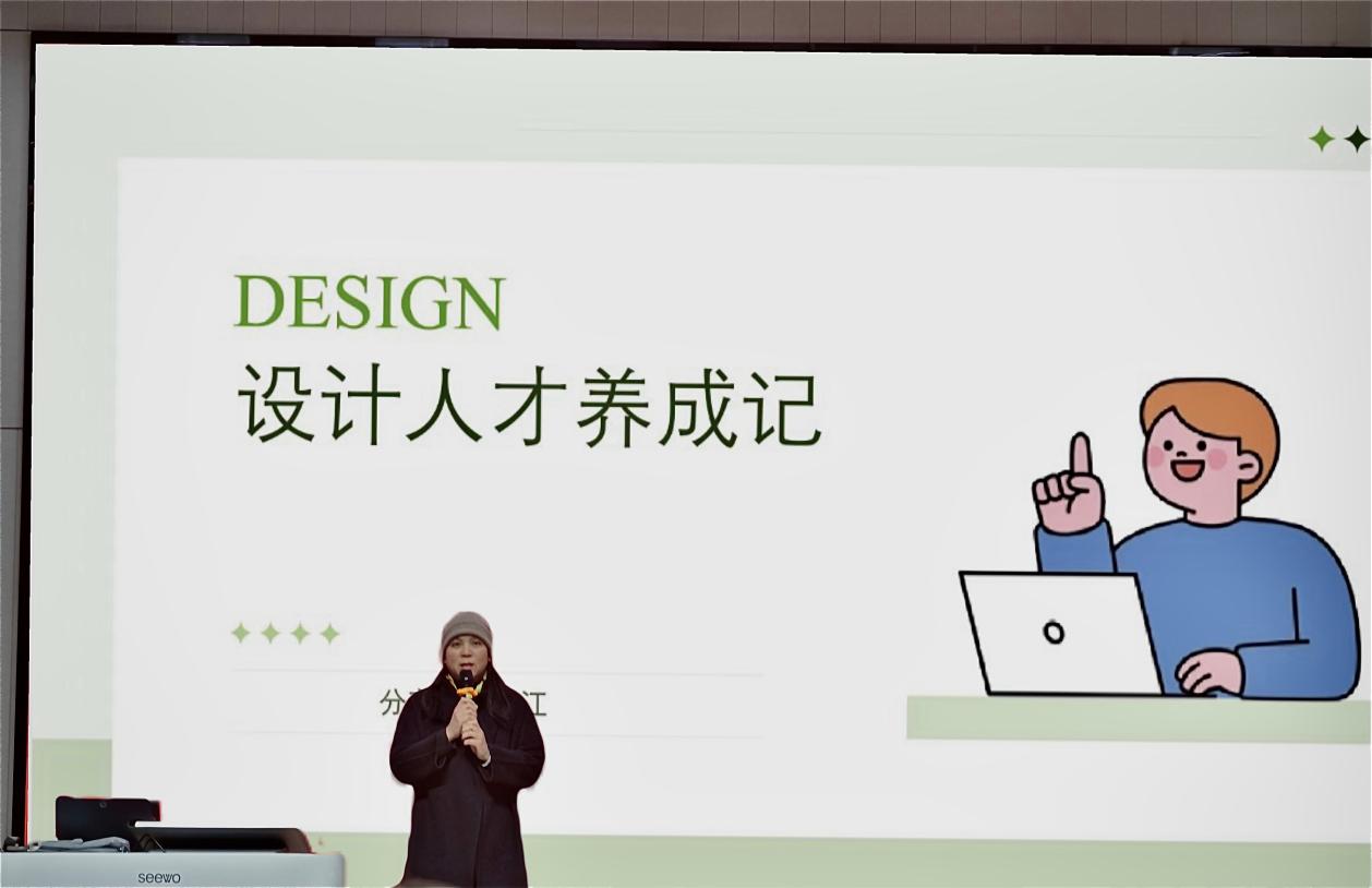 讲座中,华江老师结合二十余年实战经验,聚焦设计领域T型人才培养标准,明确此类人才需兼具专业深度与跨领域知识广度。她从设计本质、设计思维、跨界融合、职业发展路径等维度系统讲解,强调设计人才成长需融合技能学习、人文素养、设计思维、用户洞察四大要素,鼓励学子找准专业立足点,依托优质平台开展跨界协作与共创,打造个人核心竞争力。同时,她结合行业案例,解读设计师从线性发展到螺旋式成长的职业进阶路径,为学生规划设计生涯提供清晰指引。