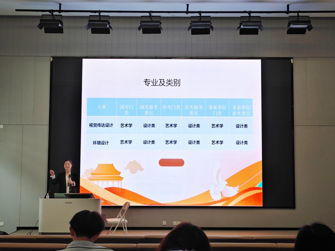 讲座围绕设计类专业可报岗位、各类考试报考时间、历年分数线、科学选岗技巧展开讲解,明确选岗对公考上岸的重要性,现场发放《艺术设计学院公考岗位一本通》等实用资料;同时系统梳理国考、省考及事业单位考试时间、笔试面试内容、体检政审要求,分析岗位工作内容、待遇与发展方向,提醒同学们合理规划复习。